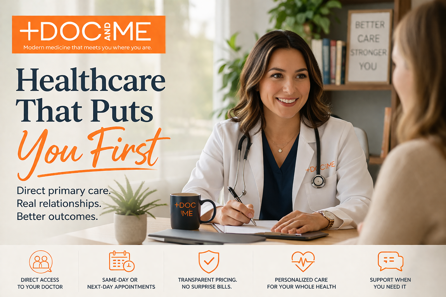 At Doc & Me Health, the focus is on direct primary care that feels personal, accessible, and built for real life. The practice describes itself as modern, concierge-style direct primary care designed around the patient rather than the insurance system, with transparent pricing, direct physician access, and care built for busy adults.